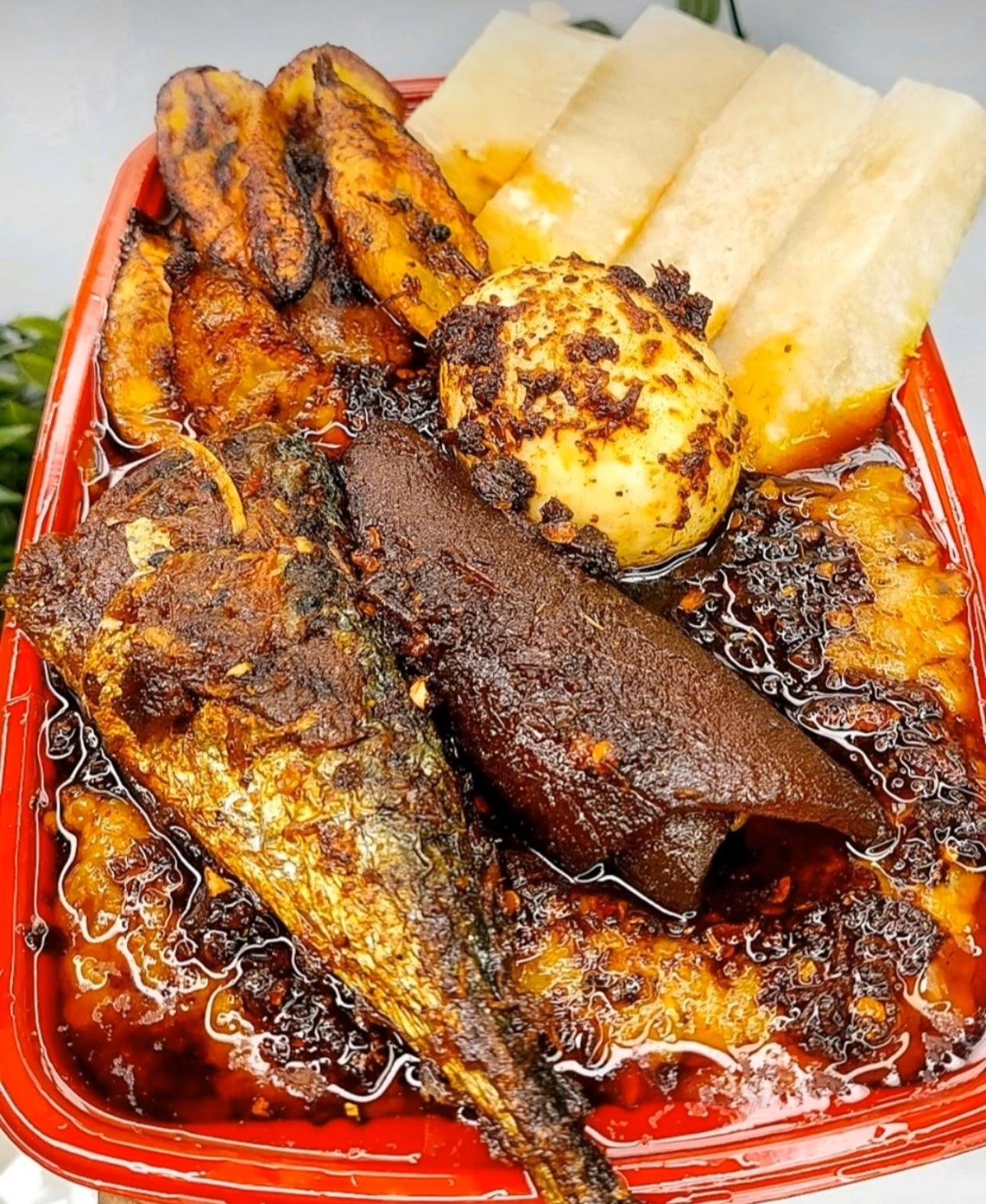 Ewa Agoyin with either yam or plantain. Garnish with varieties of proteins.